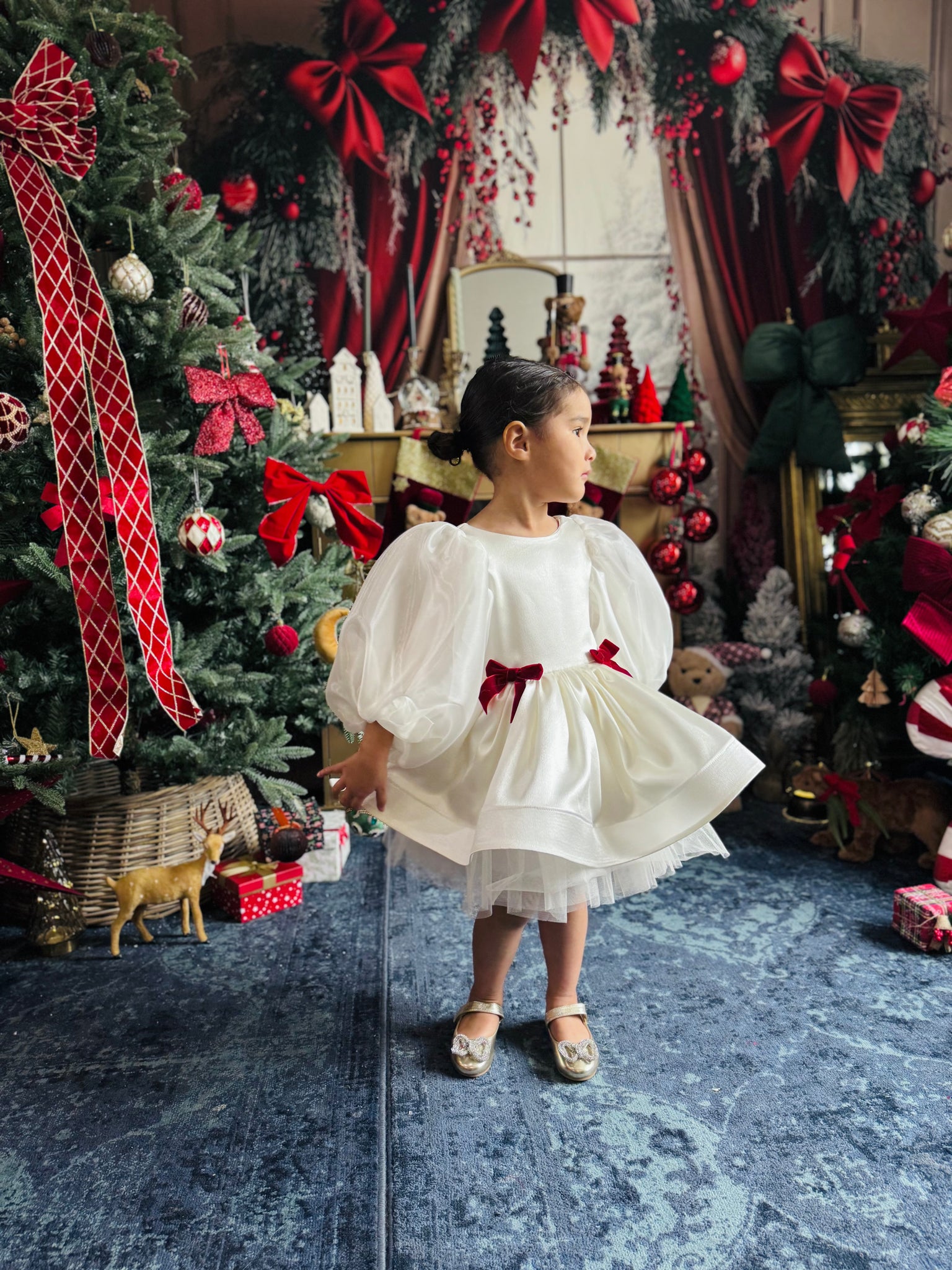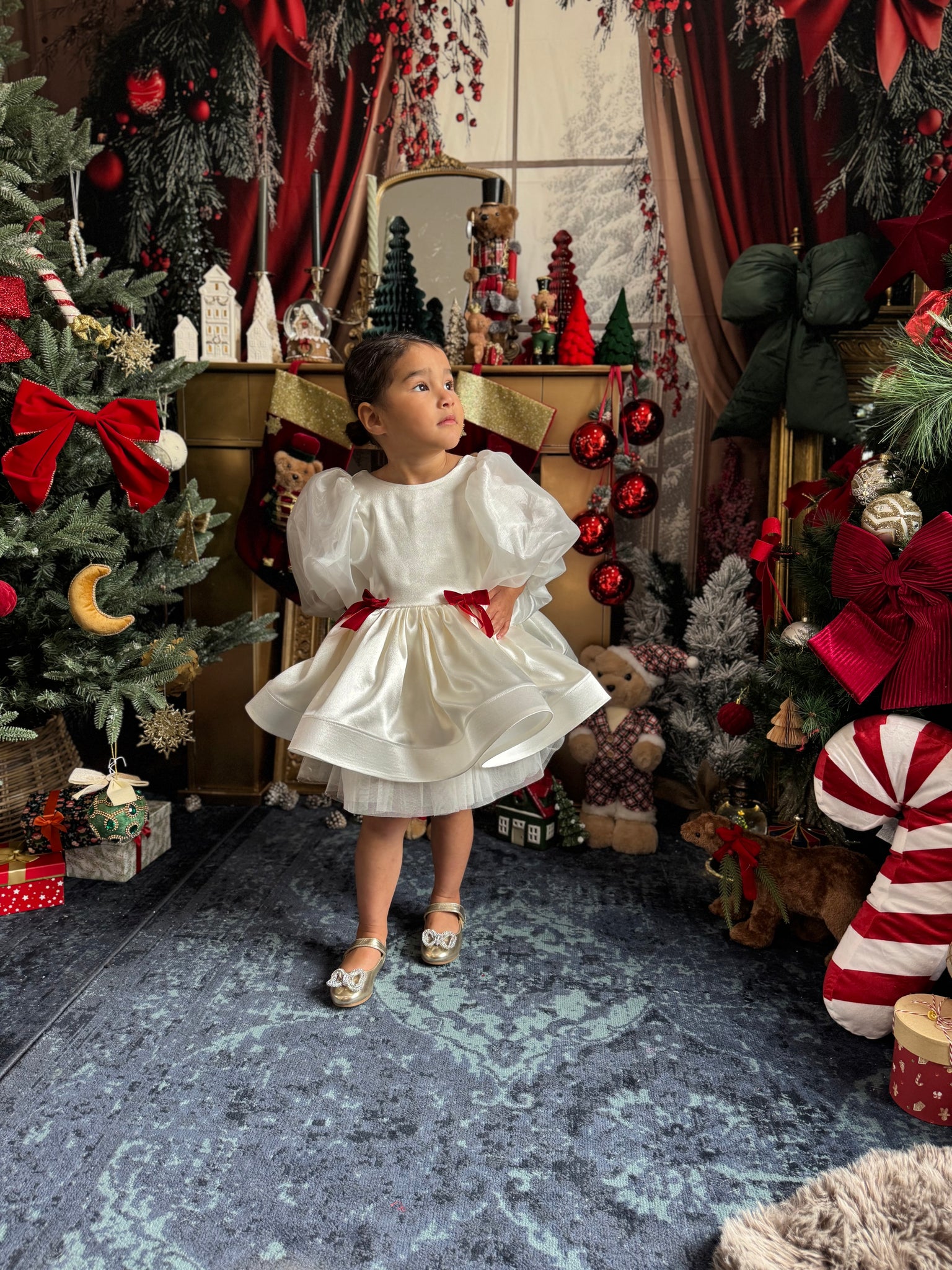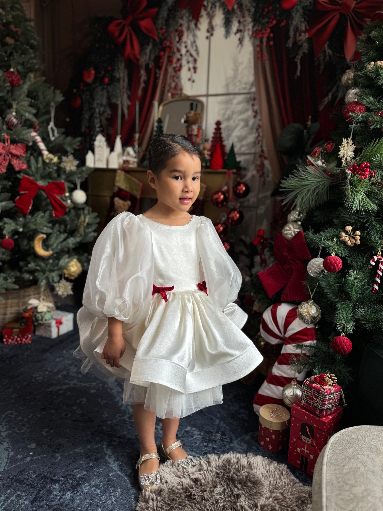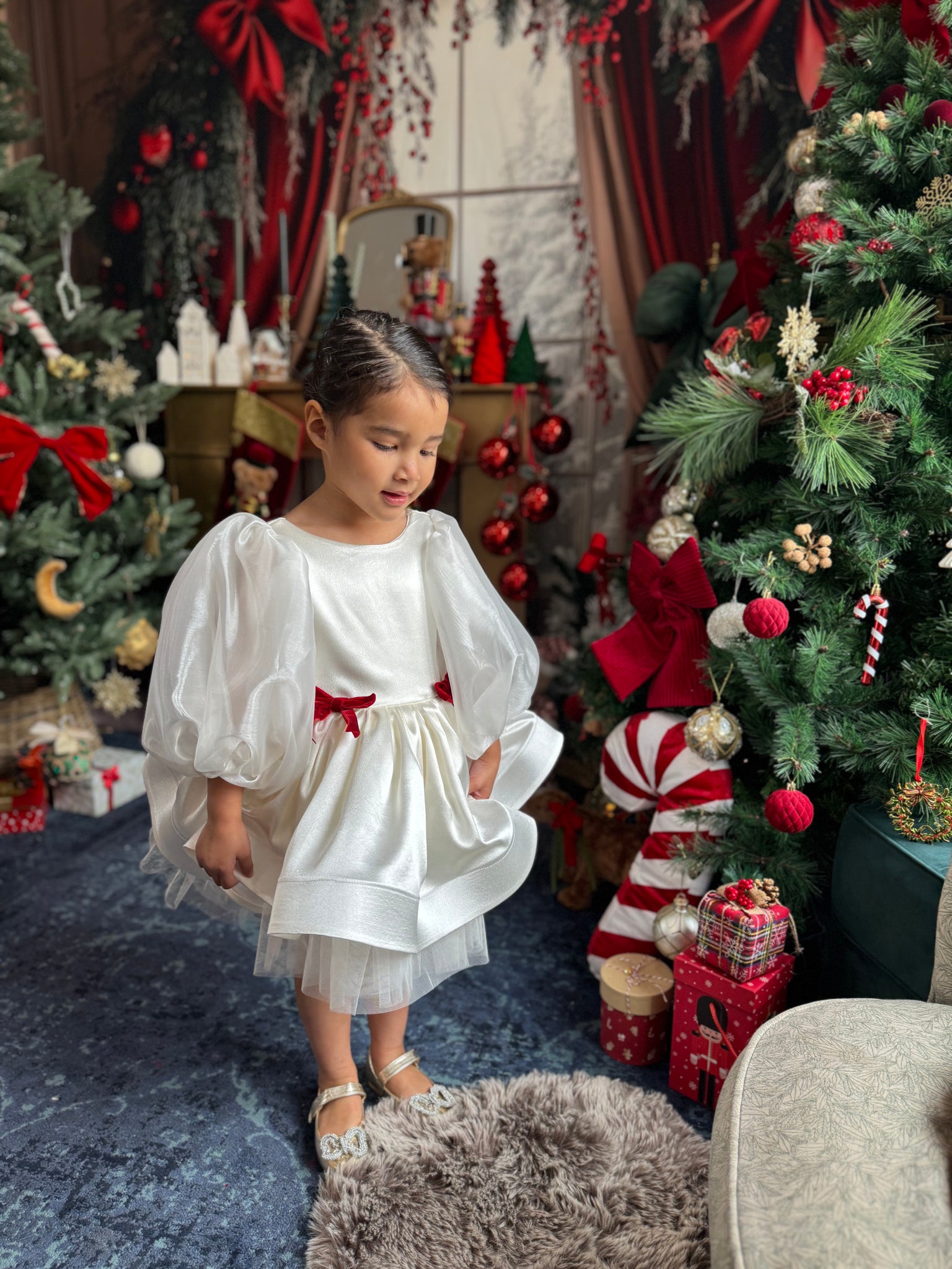 Robe satin blanc, noeuds velours rouge et manches bouffantes en organza