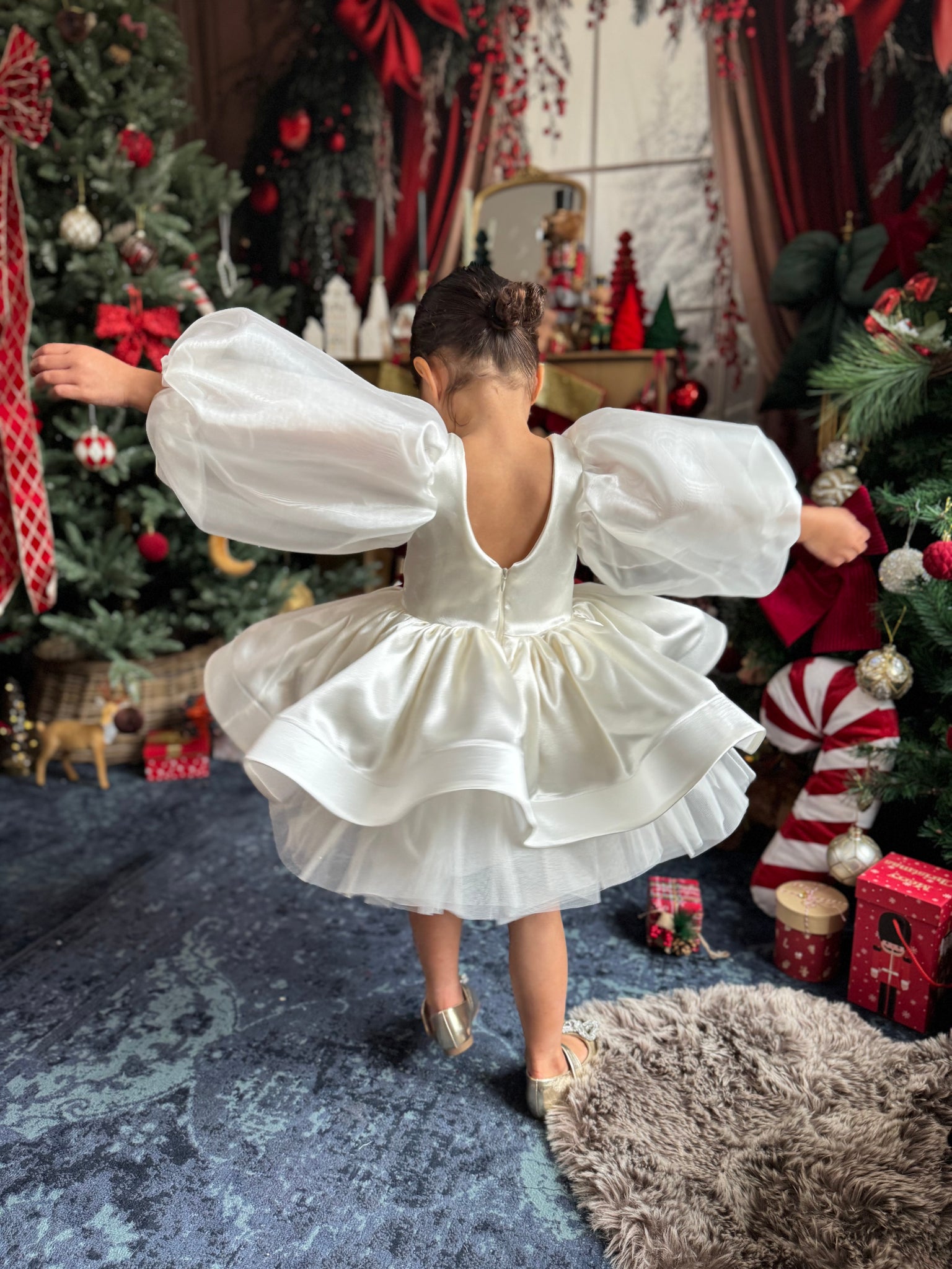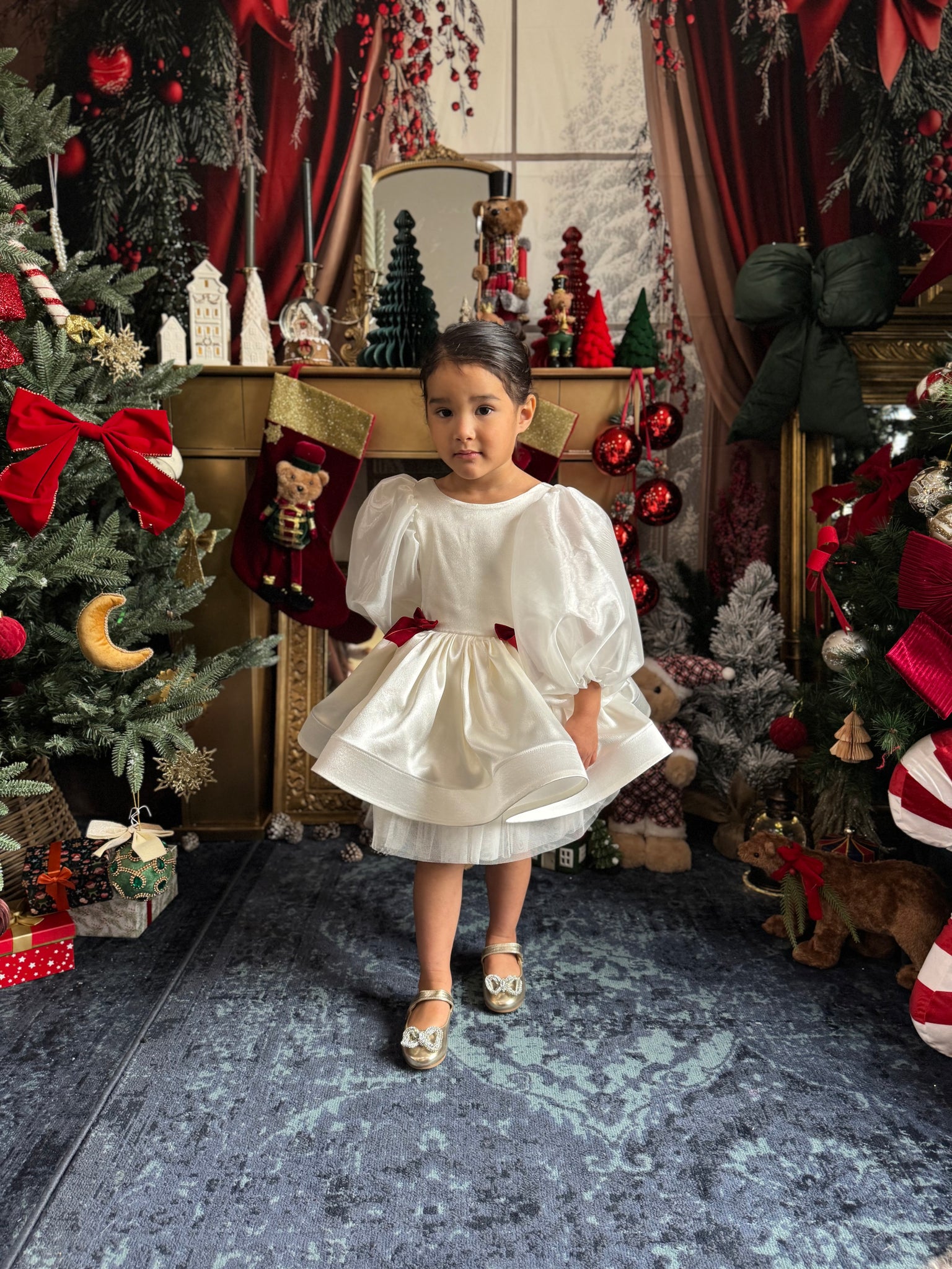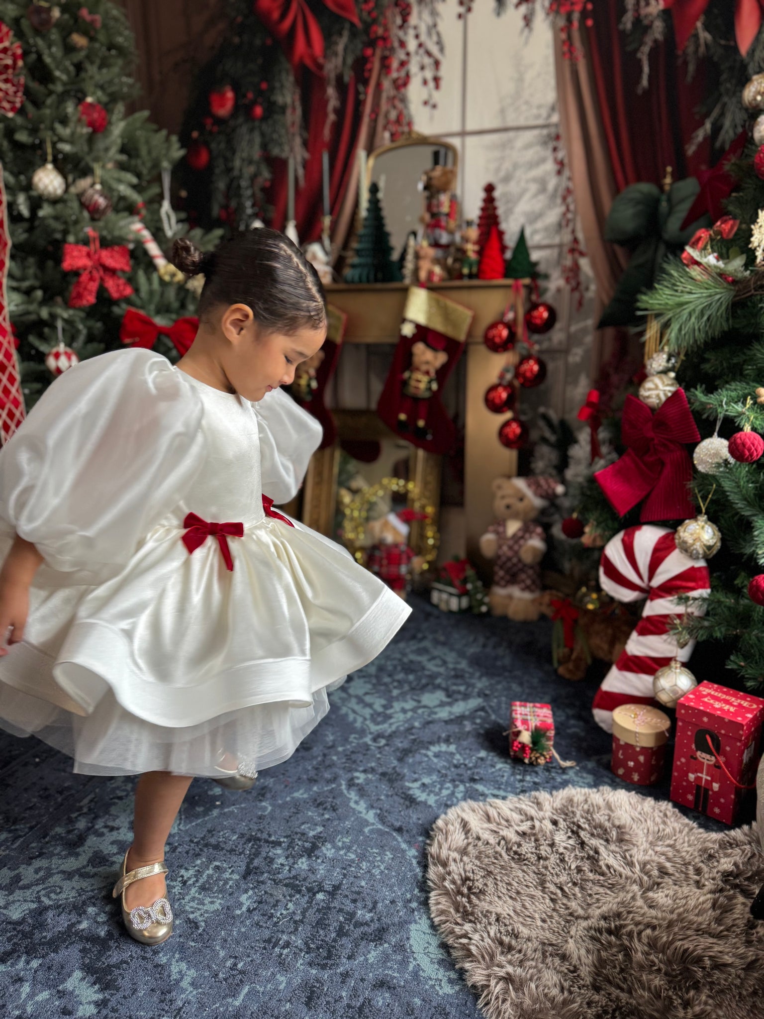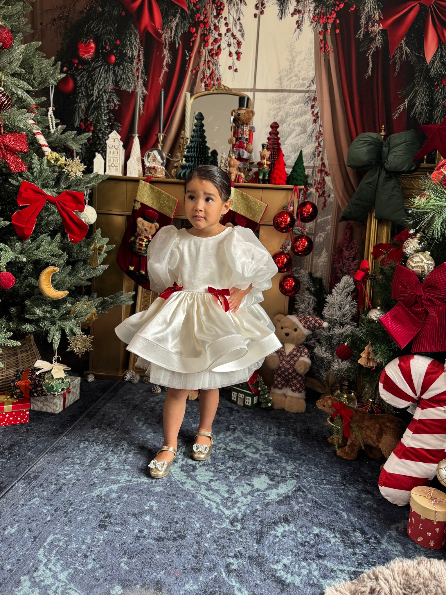 Robe satin blanc, noeuds velours rouge et manches bouffantes en organza