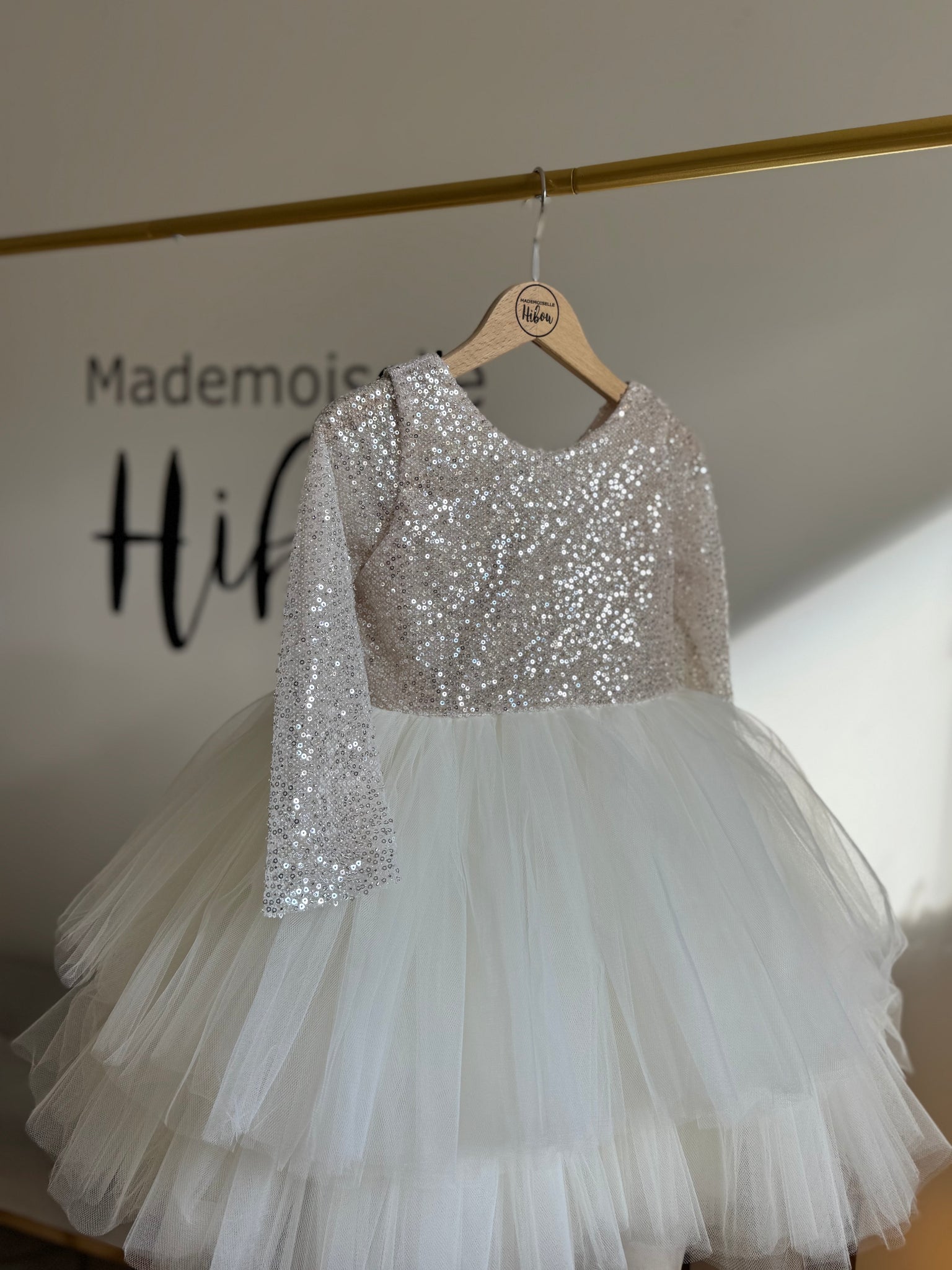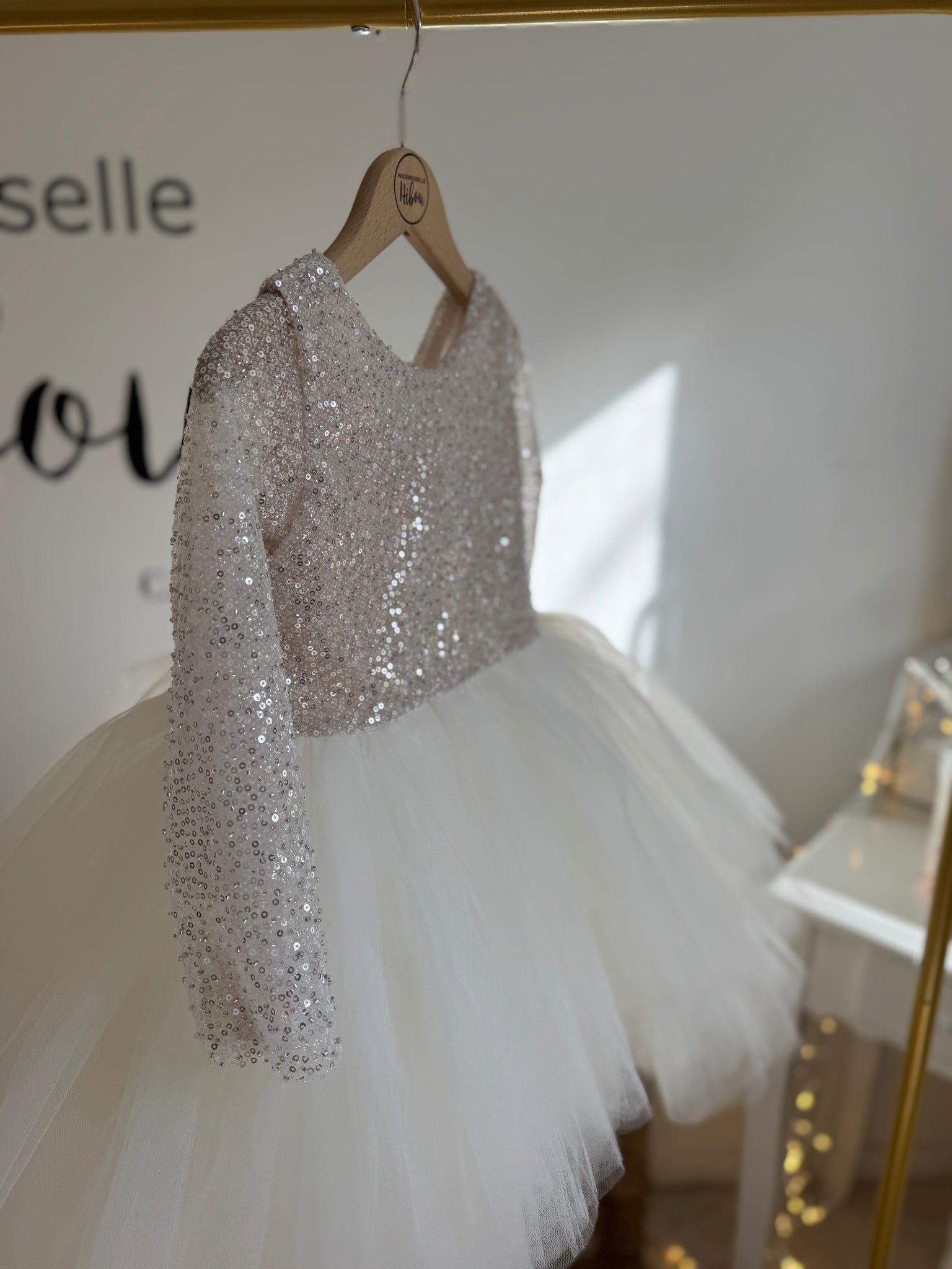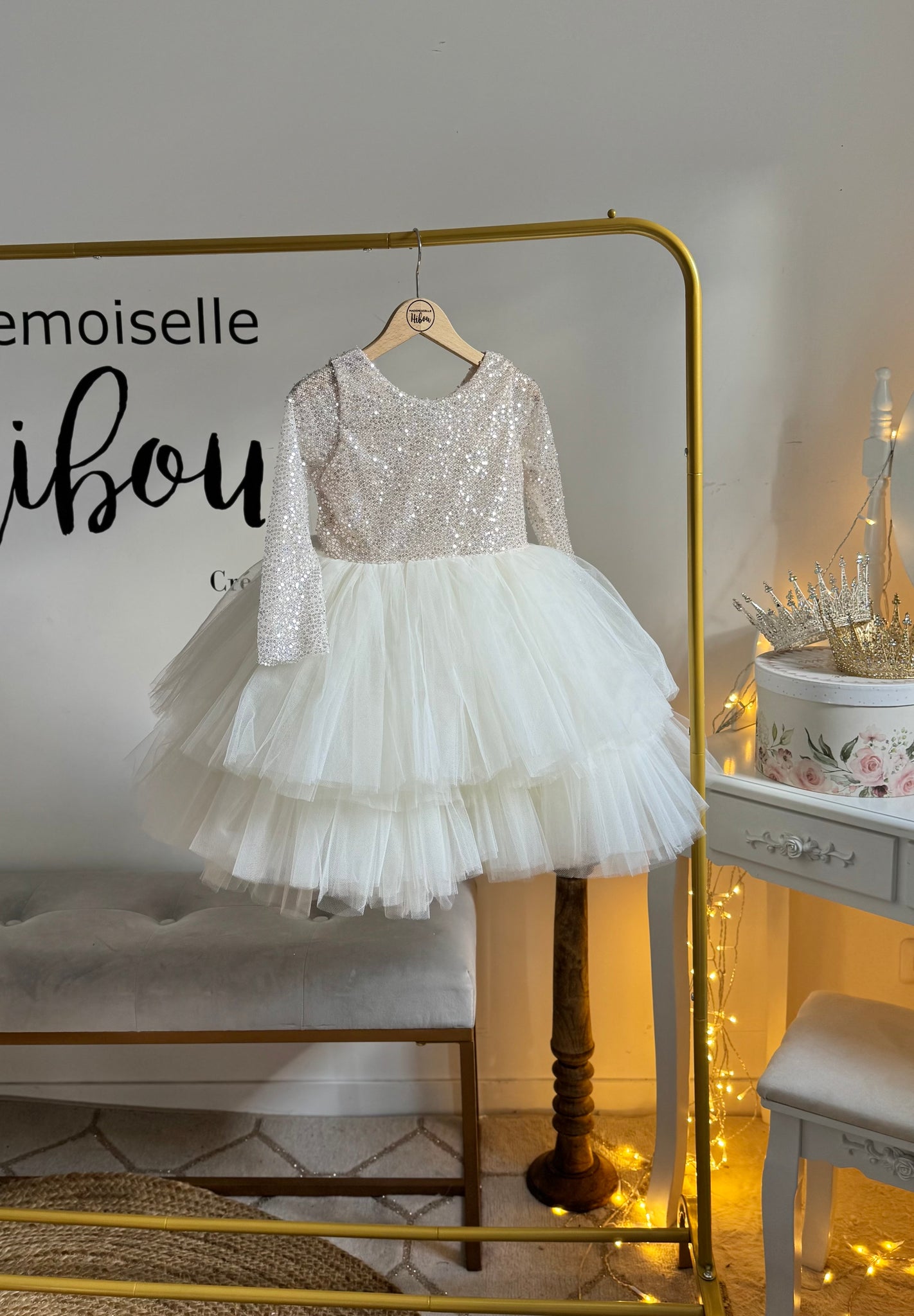 Camille est confectionné en tulle pailletté et perlé pour le buste, entièrement doublé de tulle doux beige. Le jupon est en tulle ivoire doublé d’un satin mat blanc cassé. Fermeture éclair.