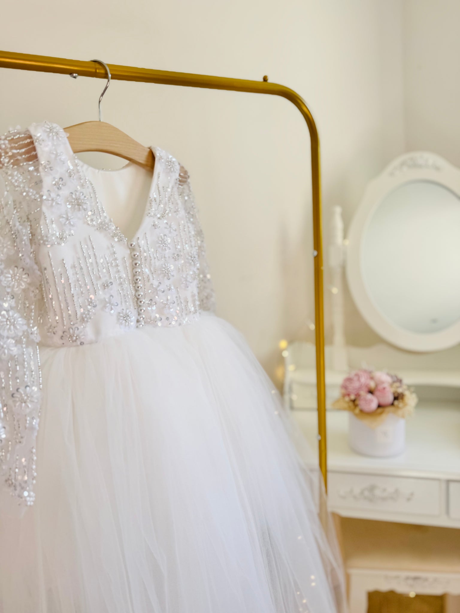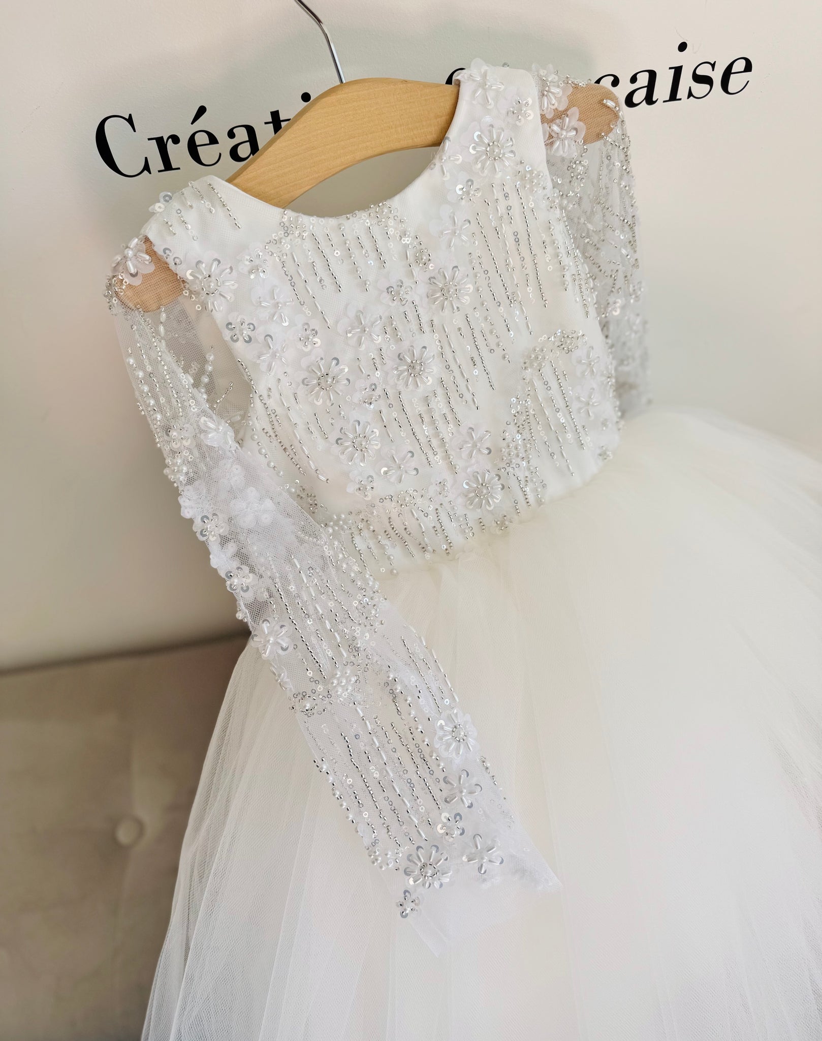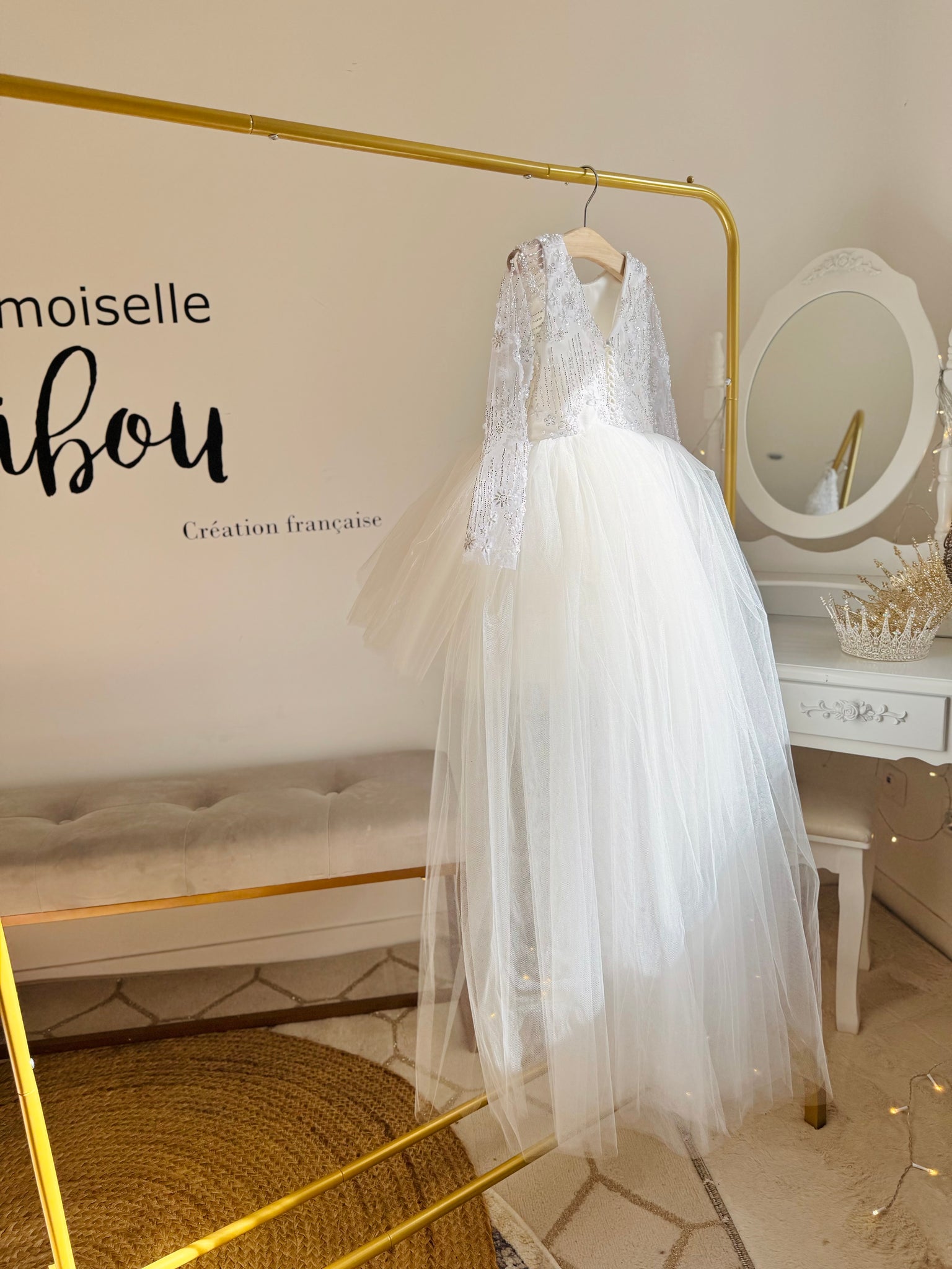 ✨ Cette robe d’exception allie raffinement et délicatesse. Son corsage est sublimé par un tulle perlé finement travaillé, offrant une brillance subtile et élégante. La jupe vaporeuse se déploie en un nuage de tulle souple blanc cassé, apportant une légèreté aérienne à l’ensemble.