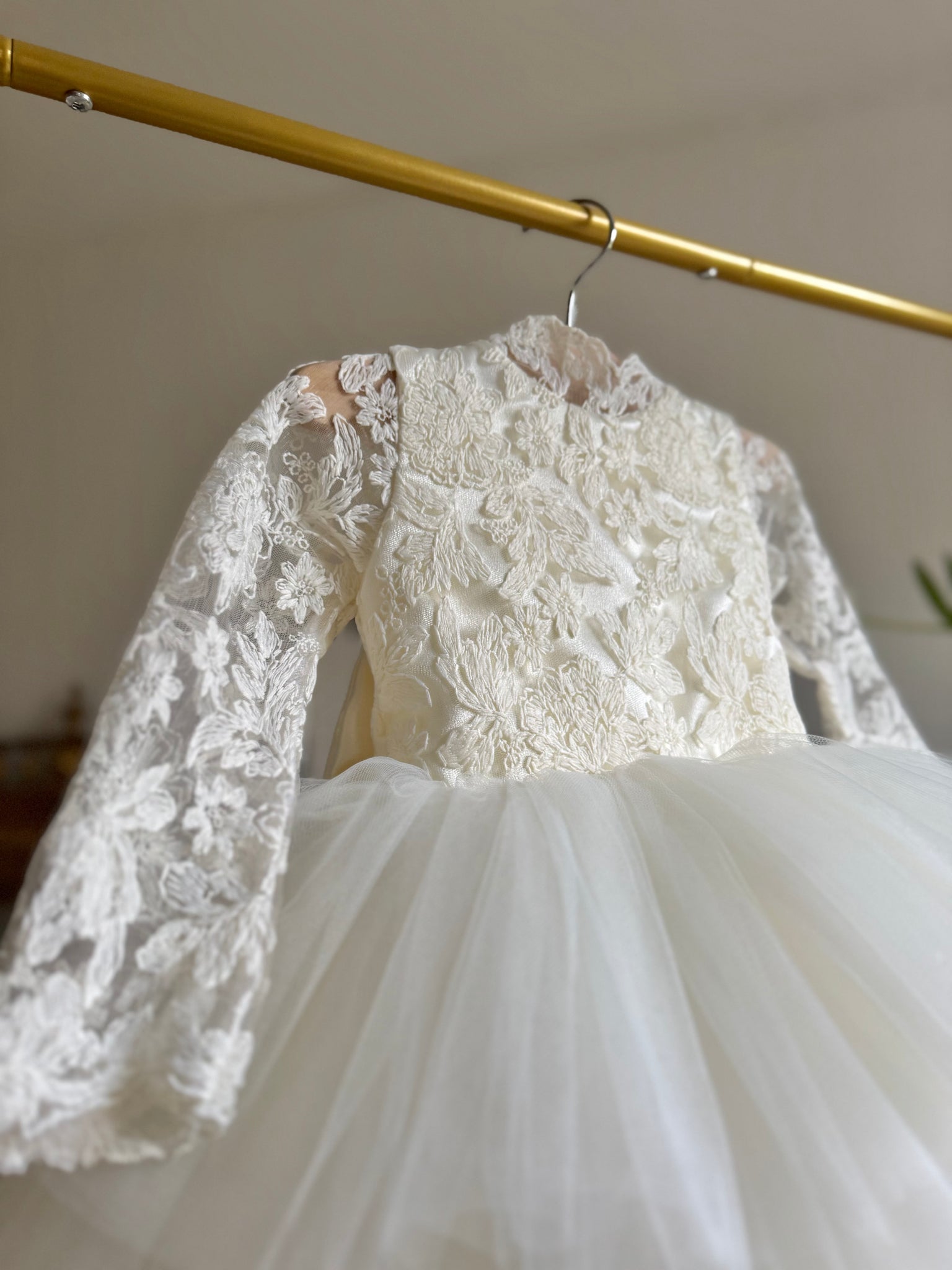 Le corsage est entièrement recouvert d'une dentelle florale brodée d'une finesse absolue. Ses manches longues, tout en transparence, laissent deviner les motifs floraux sur la peau pour un rendu poétique et intemporel. Le col montant légèrement festonné apporte une touche de noblesse supplémentaire.